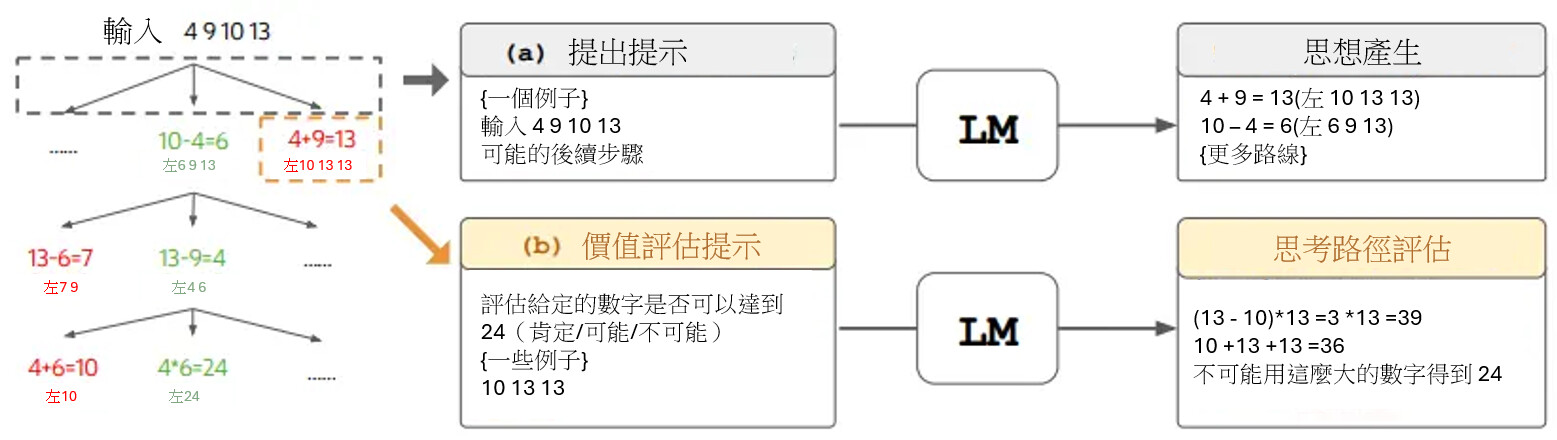 - 數學推理:例如「24 點遊戲」,模型可探索不同運算順序,評估各路徑的可行性。