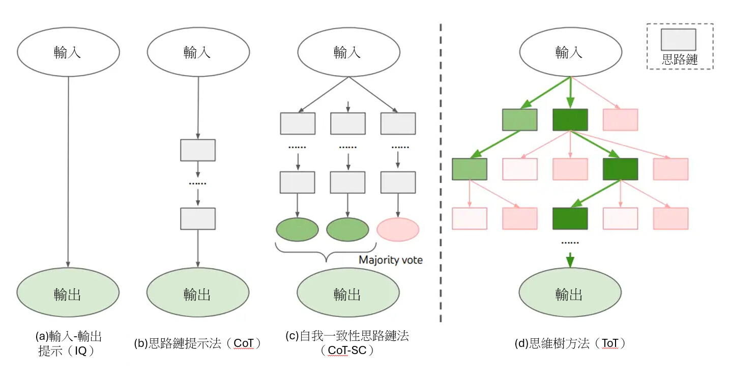 - Tree‑of‑Thought (ToT) 提供了比 CoT 更強大的推理能力,透過多路徑探索與回溯,使模型能更有效處理需要策略規劃與多步驟決策的任務。