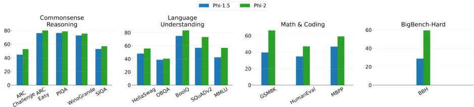 知識轉移:Phi-1.5 的知識轉移到 Phi-2,有助於模型收斂並提升多個基準測試的性能。