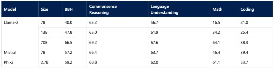 卓越基準性能:Phi-2 在各種基準測試中優於 Mistral 7B 和 Llama 2 (13B)。Phi-2 也優於 Google 的 Gemini Nano 2。