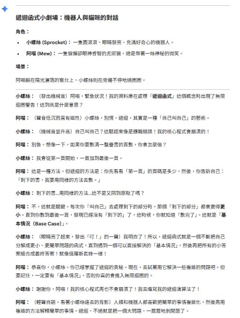 創意協作:擅長創意協作任務,像是生成新內容想法、分析趨勢以及製定針對不斷增長的受眾的策略。例如:以漫畫風格解釋遞迴函式的概念。