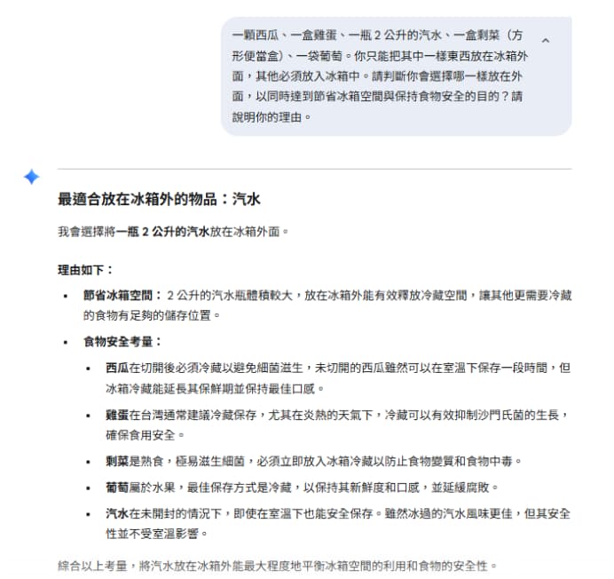 推理能力:能展現常識推理,例如空間與物品選擇。