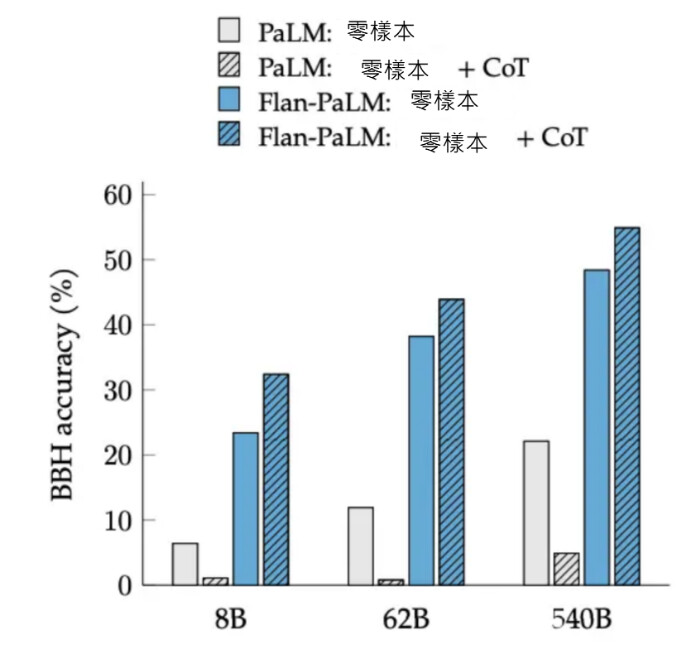 零樣本推理能力:經過 CoT 微調的模型能夠透過「讓我們先一步步思考」等提示,有效啟用零樣本推理。Flan-PaLM 在零樣本 CoT 方面的表現明顯優於未經微調的 PaLM 模型。