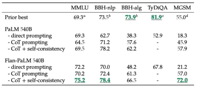 綜合策略優勢:自我一致性 (Self-consistency) 與 CoT 的結合在多個基準測試中取得了最新技術水平的結果,特別是在涉及數學問題的基準測試中(如 MGSM、GSM8K)。