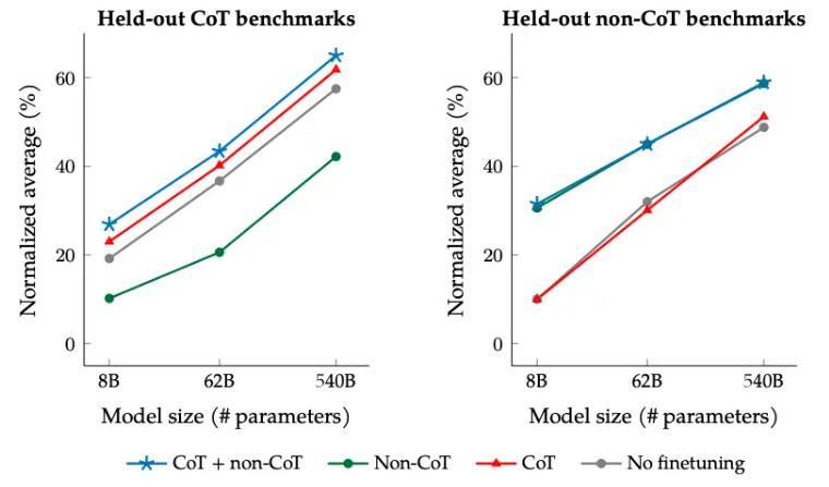 思維鏈 (CoT) 的推理強化:將 CoT 數據集納入微調中,能夠在推理任務上實現良好性能。同時對非 CoT 和 CoT 數據進行微調,相較於單獨微調,能同時改善兩者的性能。