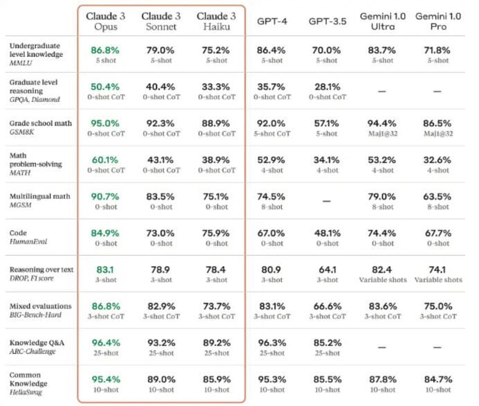 Claude 3 是 Anthropic 推出的新一代模型家族,包含三個成員:Claude 3 Haiku(最快、最具成本效益)、Claude 3 Sonnet(速度比前代 Claude 快 2 倍) 和 Claude 3 Opus(最強大的模型)。據Anthropic官方發布,Claude 3 Opus 在 MMLU(大型多任務語言理解) 和 HumanEval (程式碼生成能力)等常見基準測試中超越了 GPT-4 和所有其他模型。