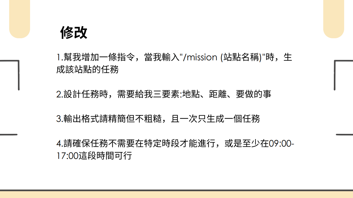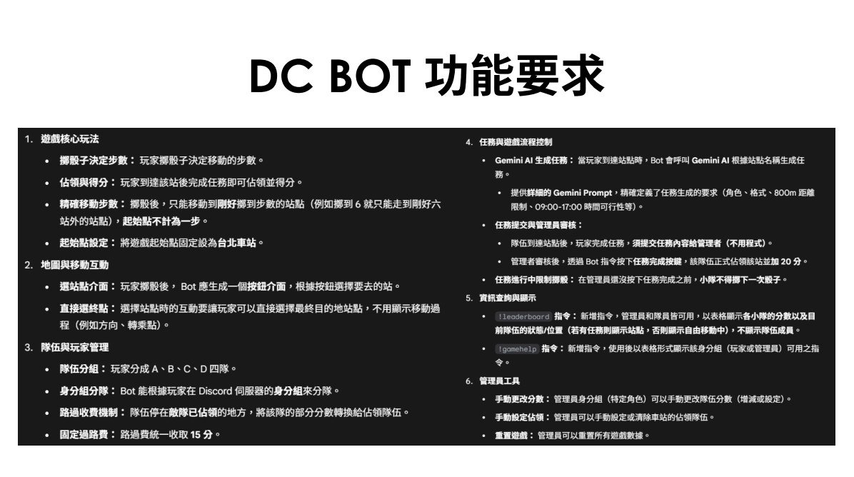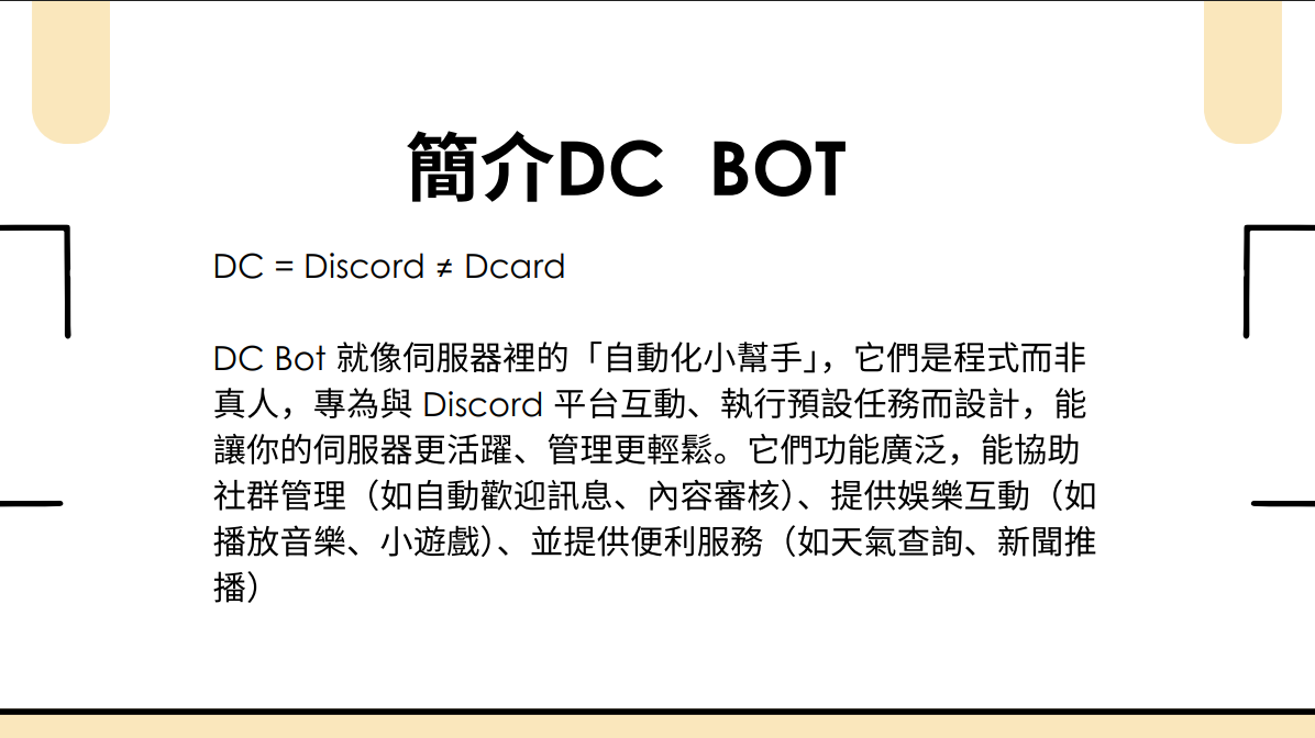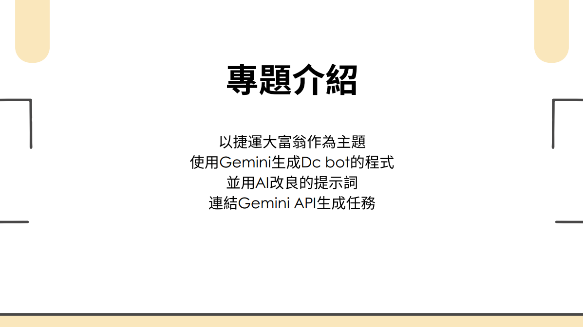 我參加這次營隊的主要動機,是希望學會如何與 AI 有效溝通,並製作一個專屬的機器人。這個機器人將在暑期社團活動中派上用場,因此我計畫利用營隊所學的技術,先行完成核心功能,讓後續能有充裕時間進行優化與調整。透過這次課程,我不僅掌握了 Prompt 的設計方法,也對 AI 的實際應用充滿信心,這更堅定了我持續鑽研 AI 技術並應用於實務情境的決心。