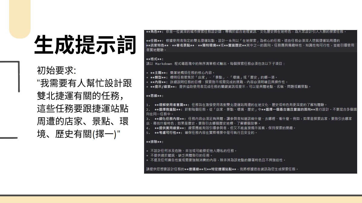 本次參加 AI 營隊中,我預期能學習到與 Prompt 相關的知識,並進一步了解生成式 AI 的應用。實際參與課程後,我領悟了如何運用人工智慧來建構指令(Prompt)的技巧,並深入掌握了將這些指令靈活應用於各種情境的方法。課程內容結合理論與實作,透過講師生動的投影片演示及互動式教學,我能輕鬆理解抽象概念,並在分組討論與協作中激發更多創新思維。這兩日的學習歷程,讓我對生成式 AI 的運作機制與應用潛力有了更全面的認識,也深刻感受到 AI 在提升效率與激發創意方面的價值。