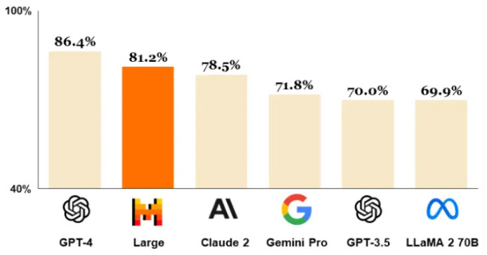 基準測試排名:在 MMLU 基準測試中,Mistral Large 獲得 81.2% 的分數,僅次於 GPT-4,位居第二。