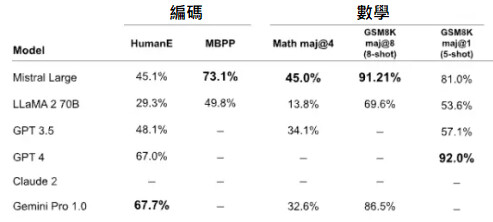 數學與程式碼生成:在 Math 和 GSM8K 基準測試中表現強勁,但在程式碼生成基準測試中顯著落後於 Gemini Pro 和 GPT-4。