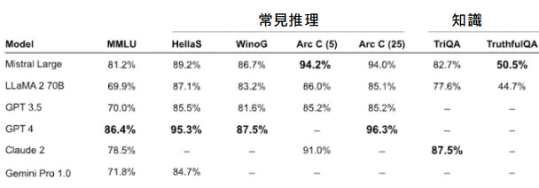 推理與知識:雖然整體表現落後於 GPT-4,但優於 Claude 2 和 Gemini Pro 1.0。