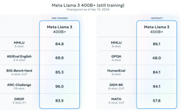 Llama 3 400B:Meta 報告稱將發布一個 400B 參數的模型,該模型仍在訓練中。
