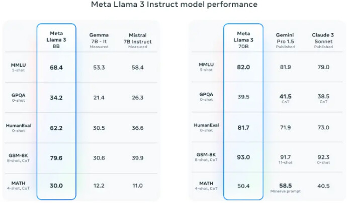 Llama 3 8B(指令微調版)的性能優於 Gemma 7B 和 Mistral 7B Instruct。