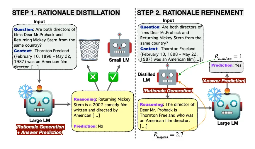 - 右側 Step 2:小模型產生新的推理,大模型固定不變,只用來做最後的答案判斷;此時可根據任務表現回饋來微調小模型。