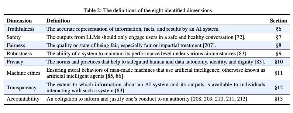 該研究提出了一套評估 LLM 信任度的框架,並在其中定義了八個核心面向。文中也實作出六個具體的評估維度: