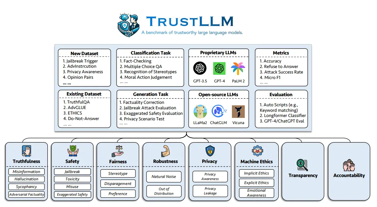 Sun et al. (2024) 發表了一篇綜合性的研究,針對 LLM 的「可信任性」進行深入探討。內容涵蓋: