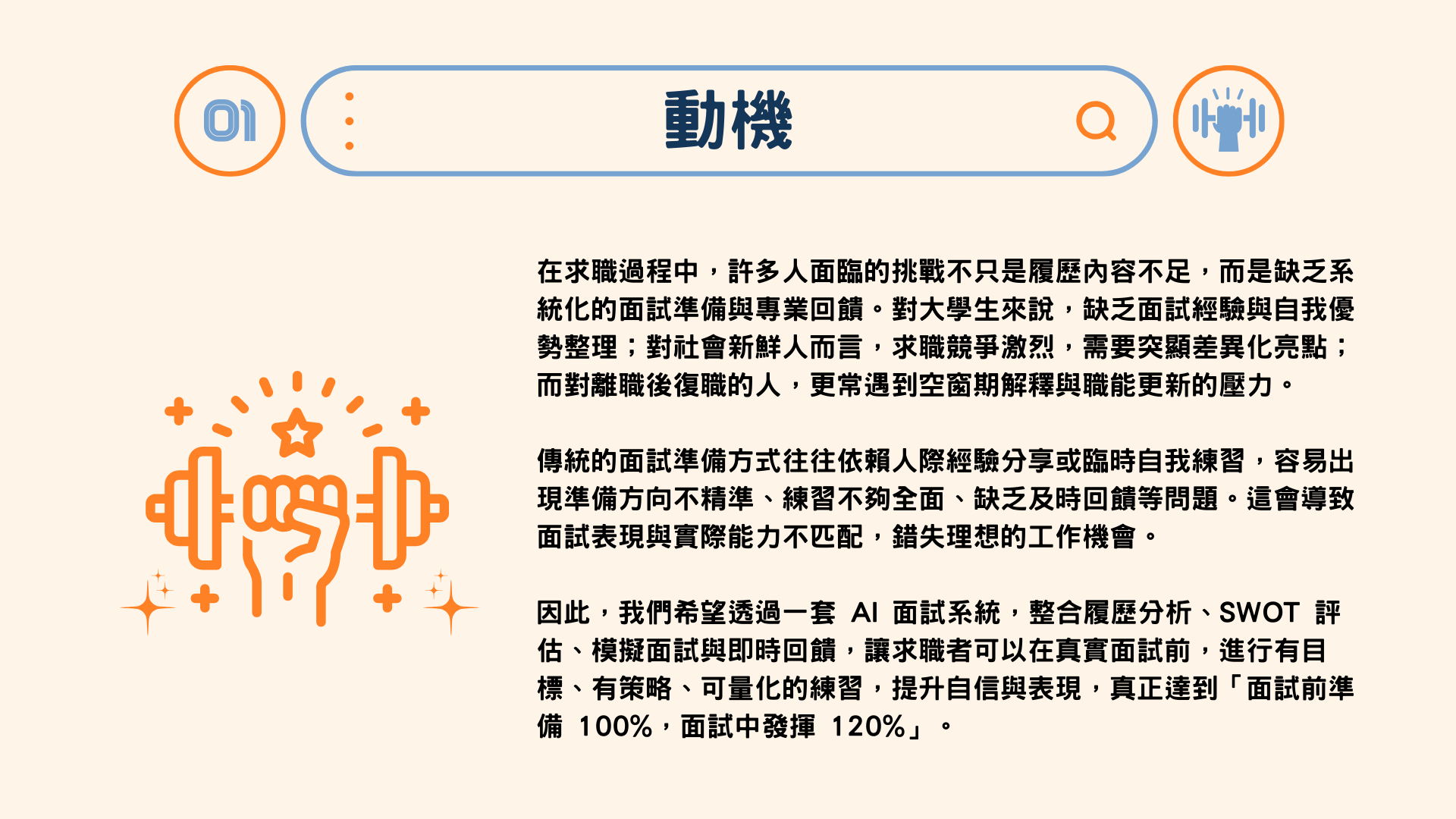 因此,我們希望透過一套 AI 面試系統,整合履歷分析、SWOT 評估、模擬面試與即時回饋,讓求職者可以在真實面試前,進行有目標、有策略、可量化的練習,提升自信與表現,真正達到「面試前準備 100%,面試中發揮 120%」。