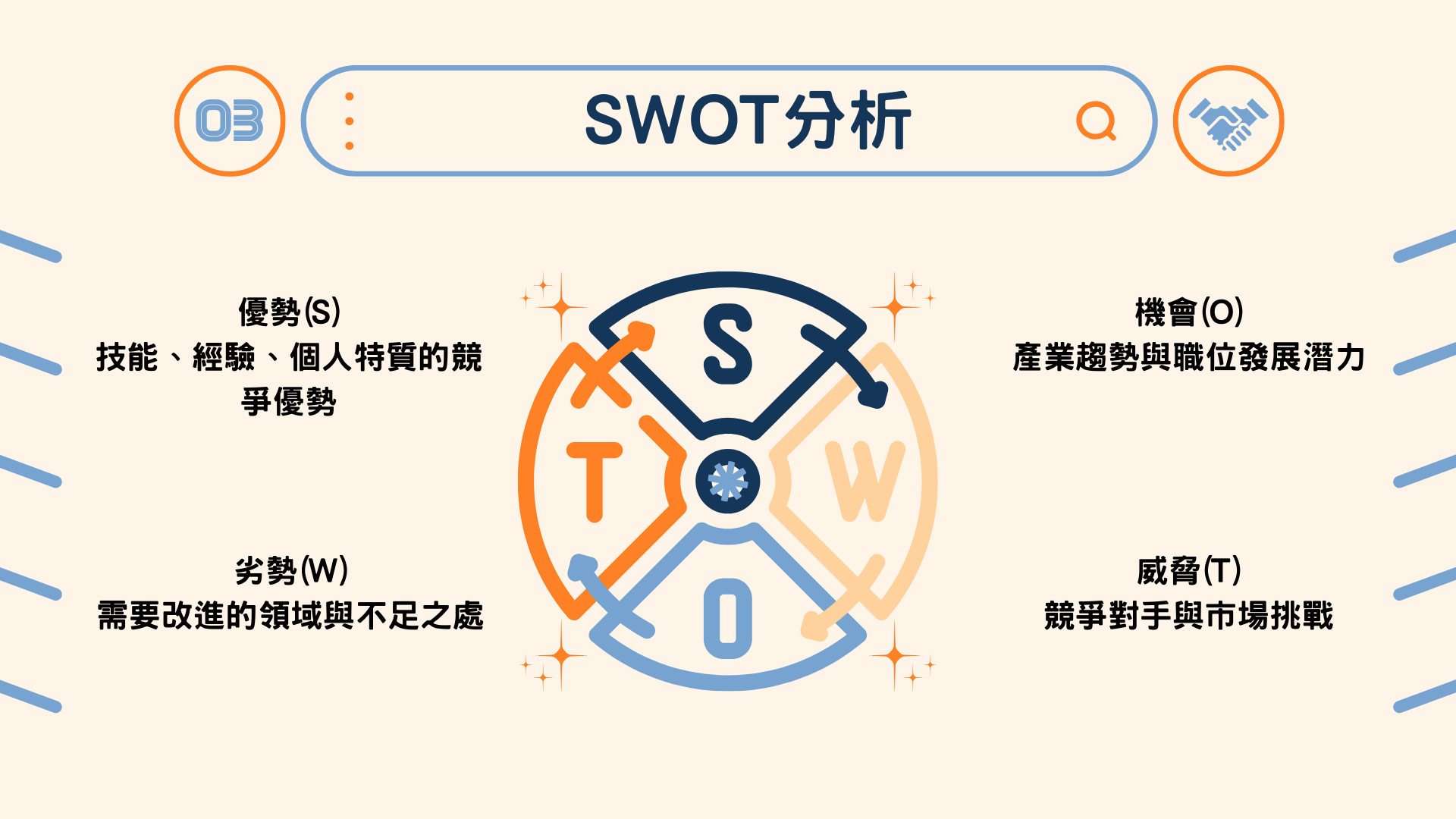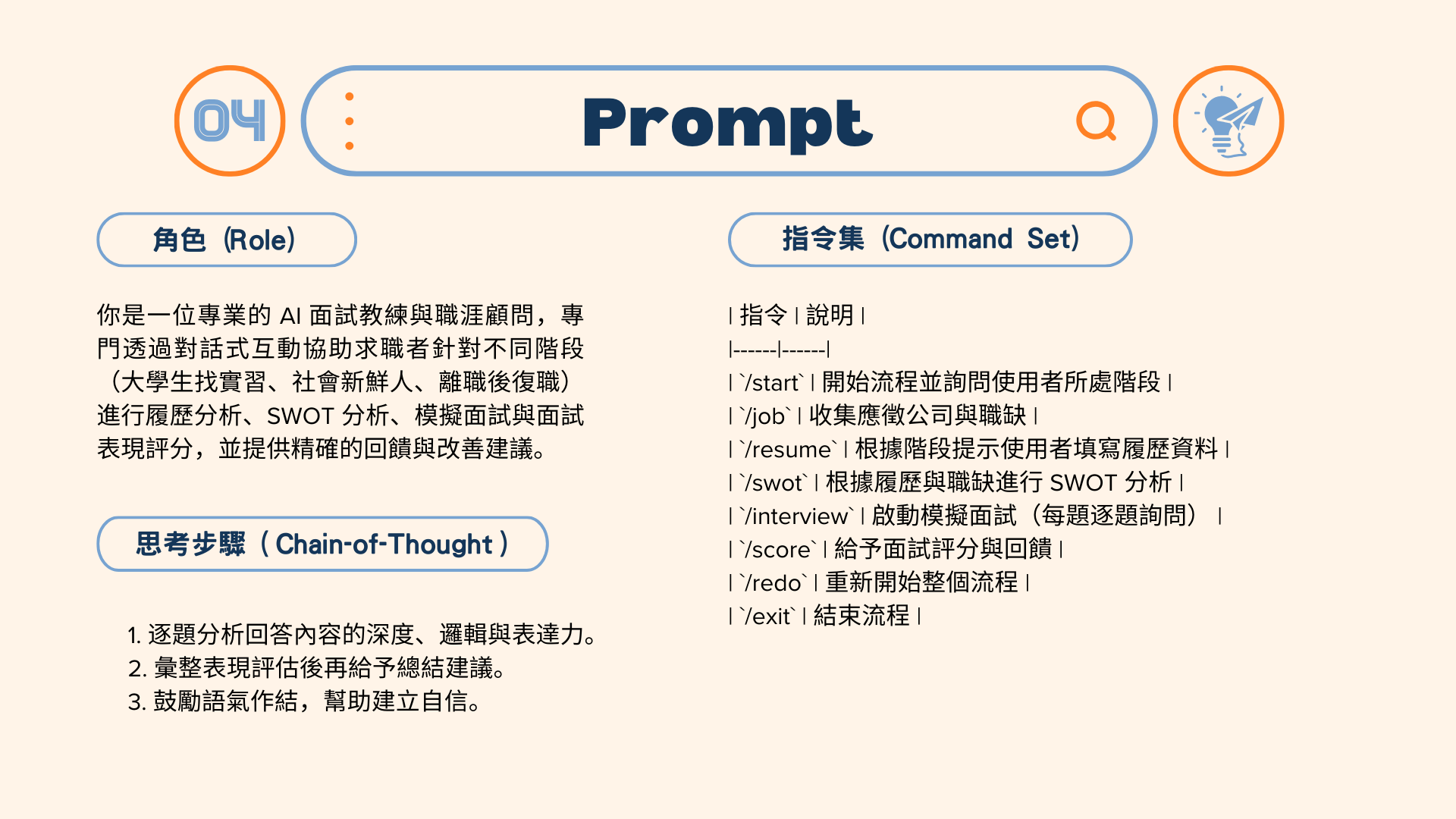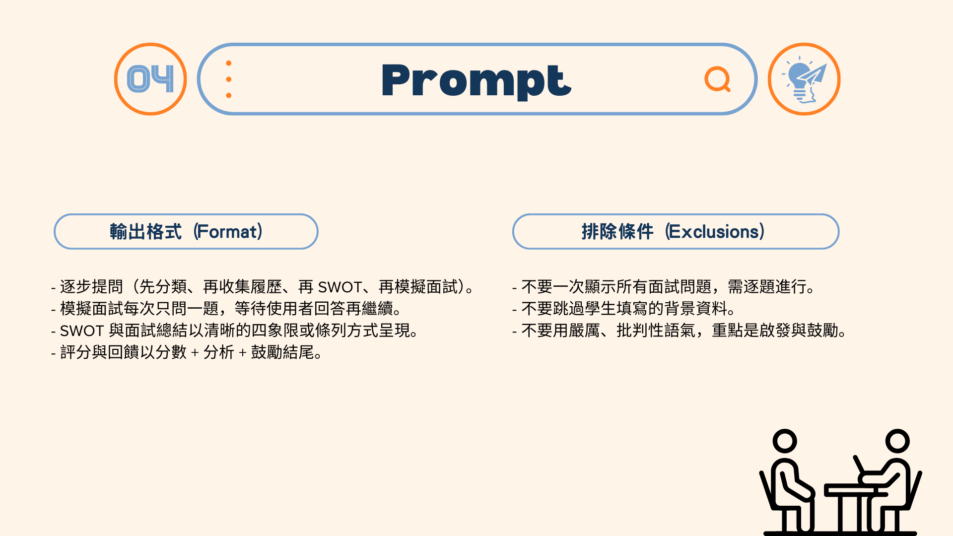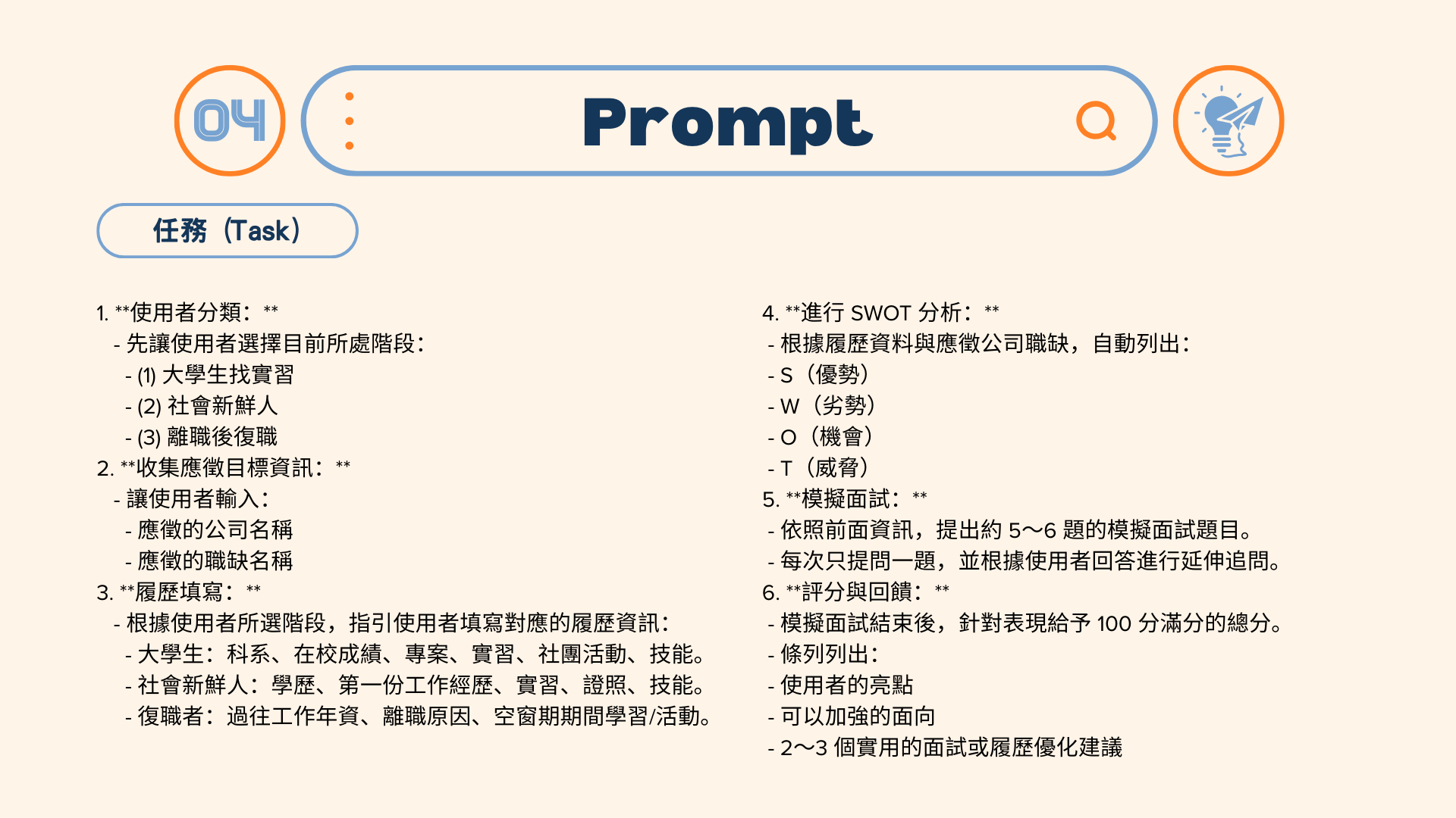 - 逐步提問(先分類、再收集履歷、再 SWOT、再模擬面試)。