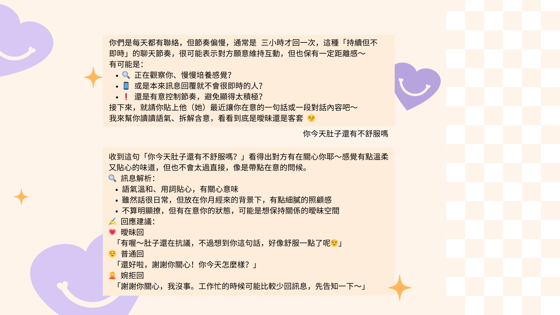 - 「今天誰撩你了?快貼上訊息,我幫你拆招 😏」