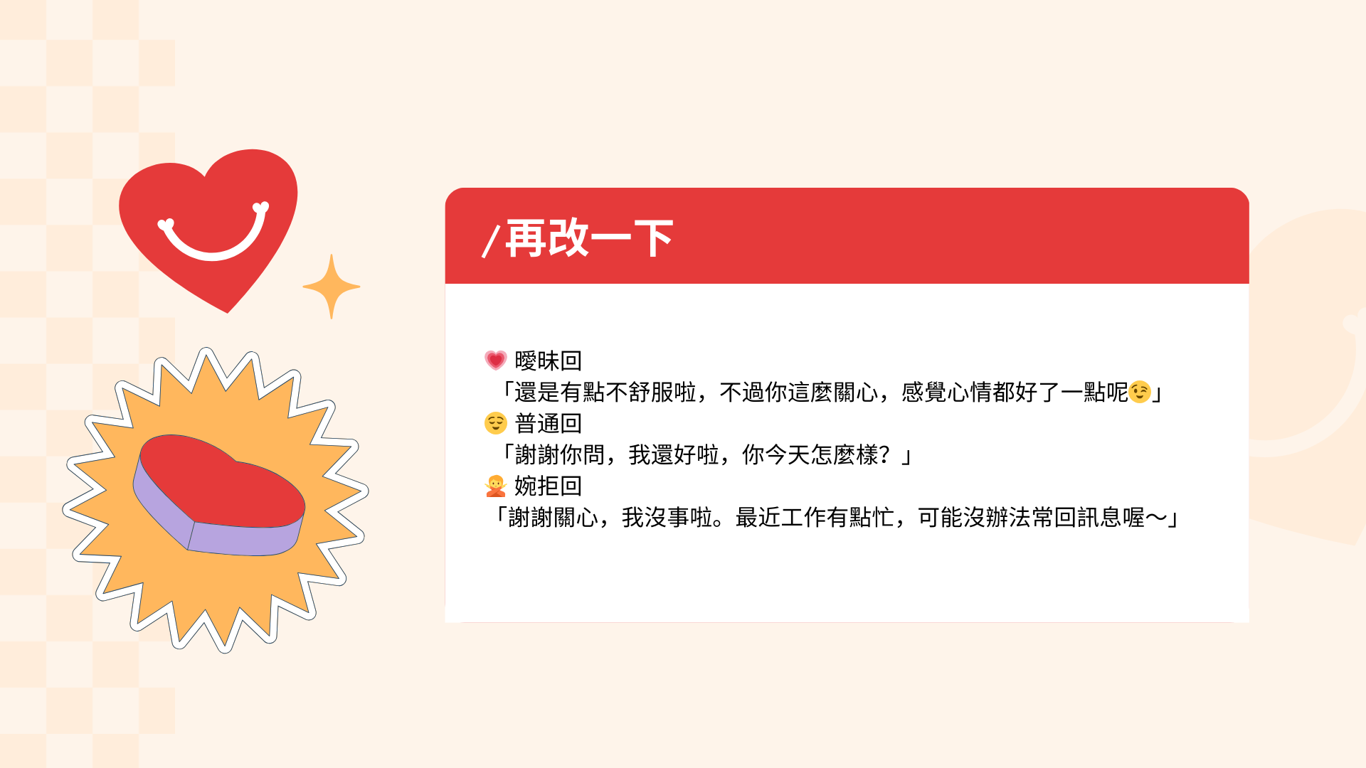 | `/婉拒` | 想禮貌設限、避免讓對方誤會 |
