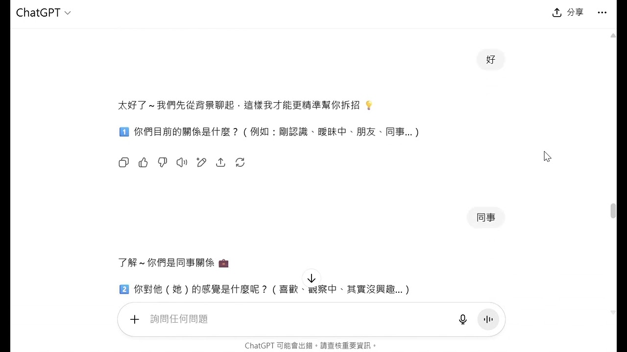 1️⃣「你們目前的關係是什麼?(例如:剛認識、曖昧中、朋友、同事...)」