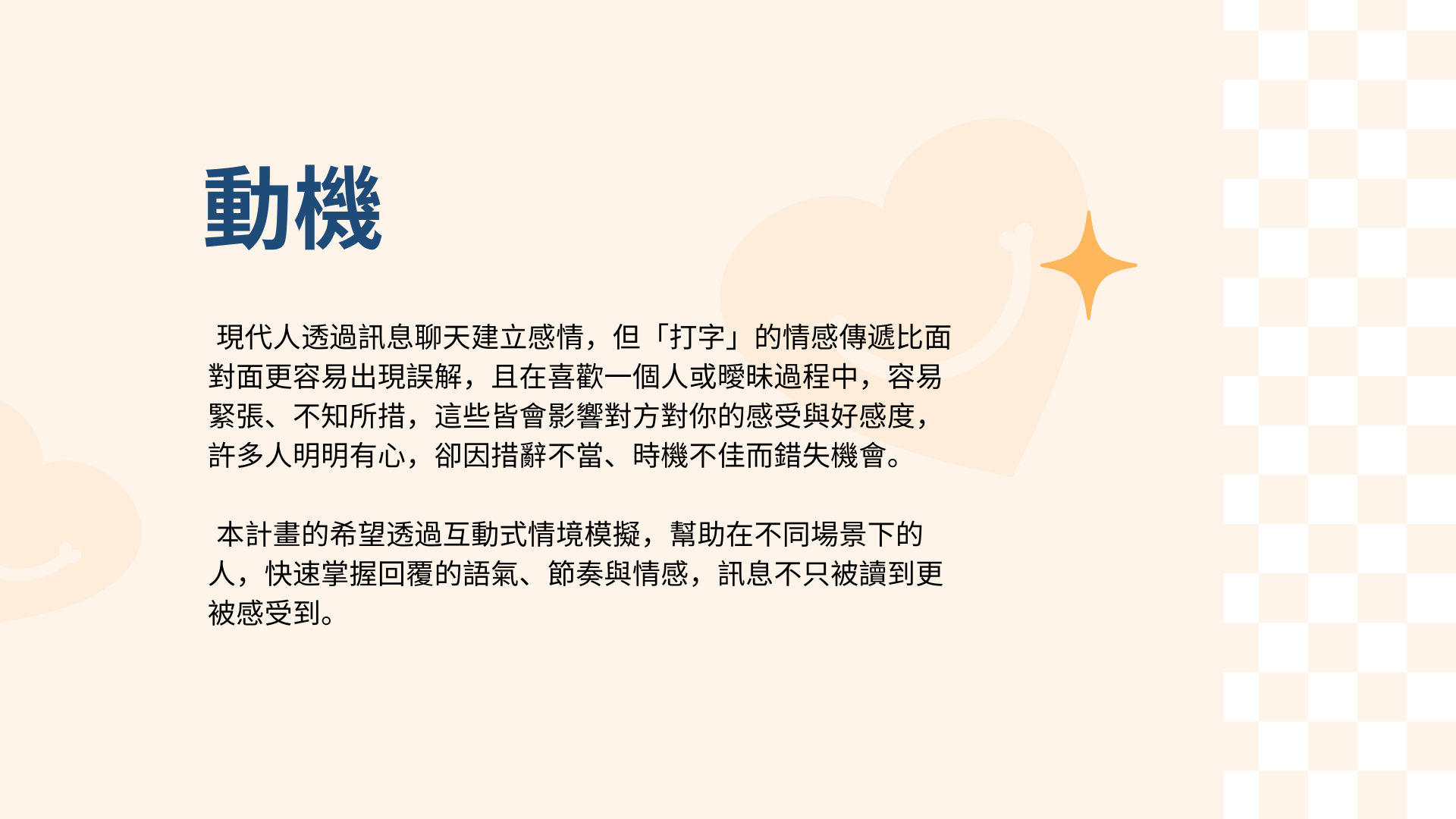 本計畫的希望透過互動式情境模擬,幫助在不同場景下的人,快速掌握回覆的語氣、節奏與情感,訊息不只被讀到更被感受到。