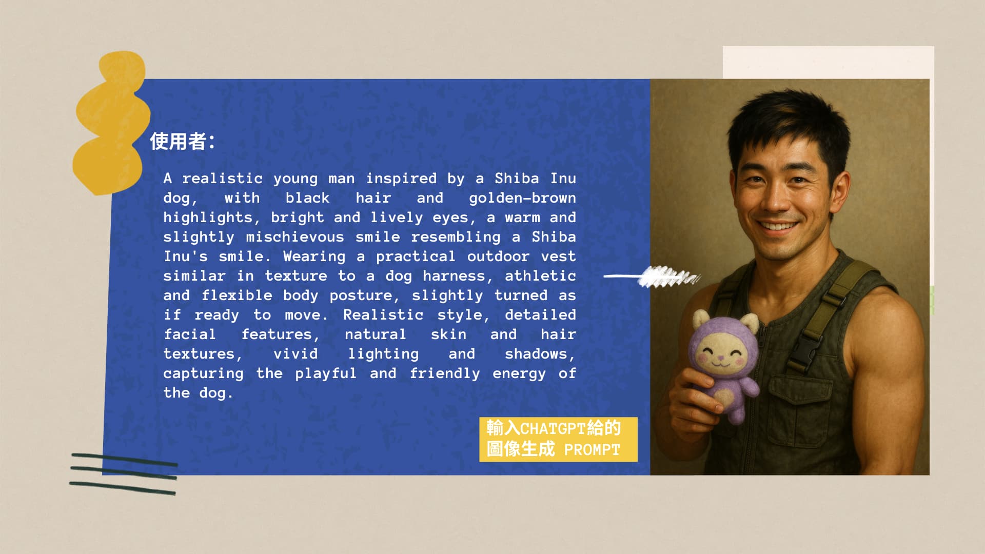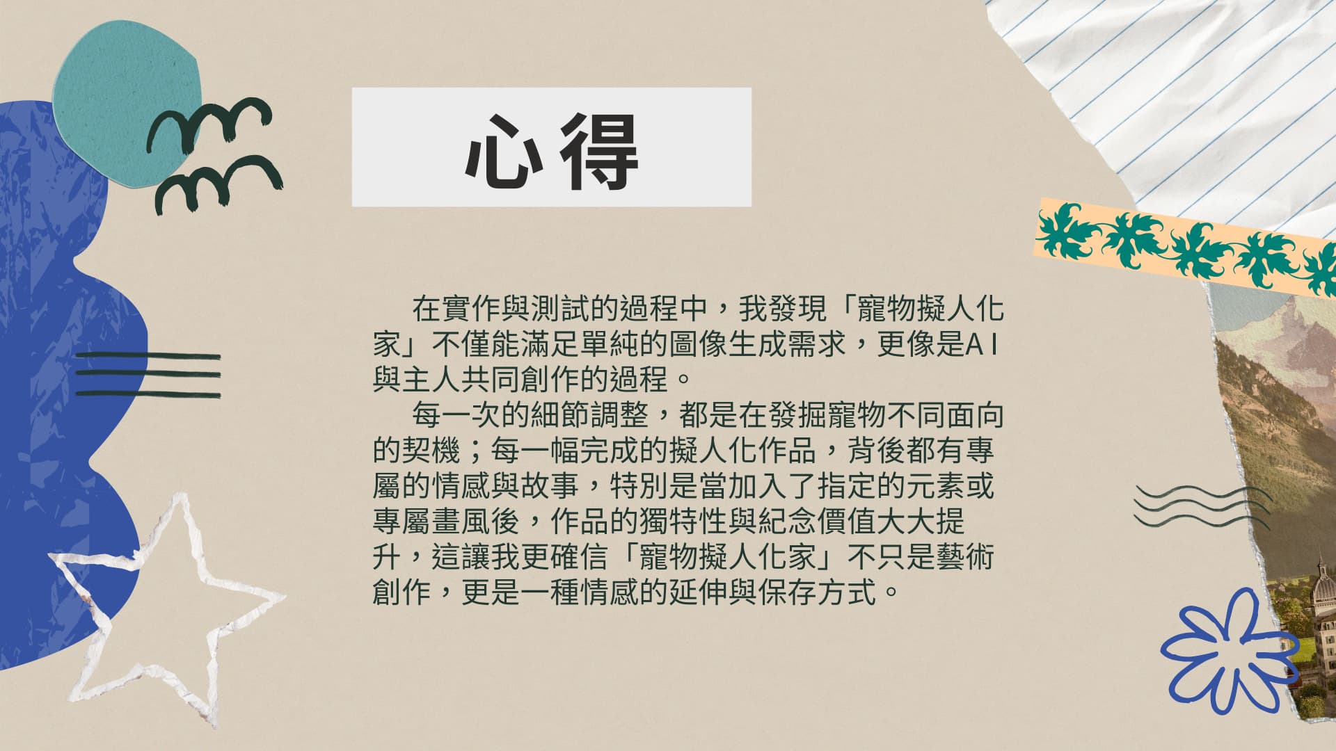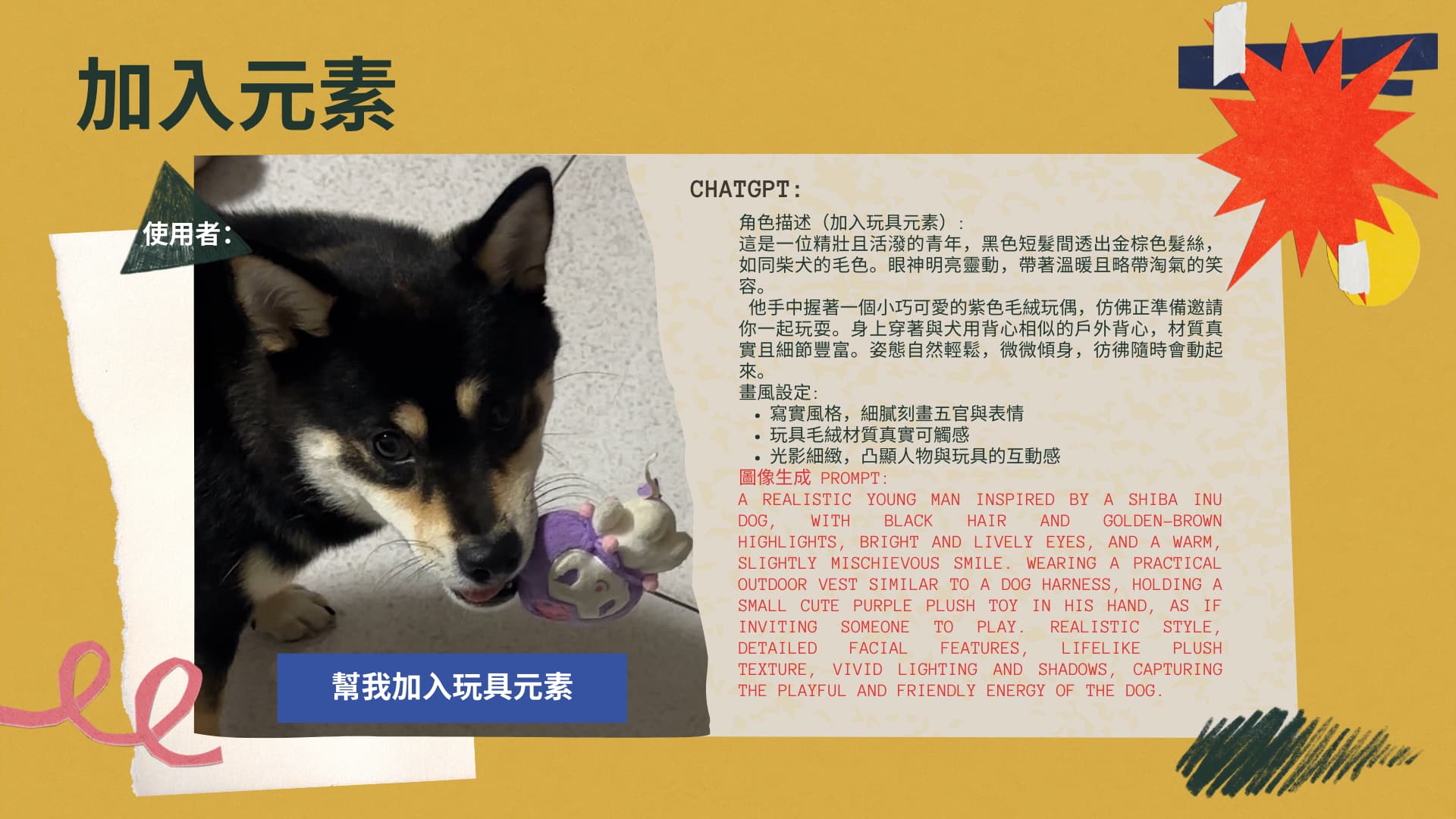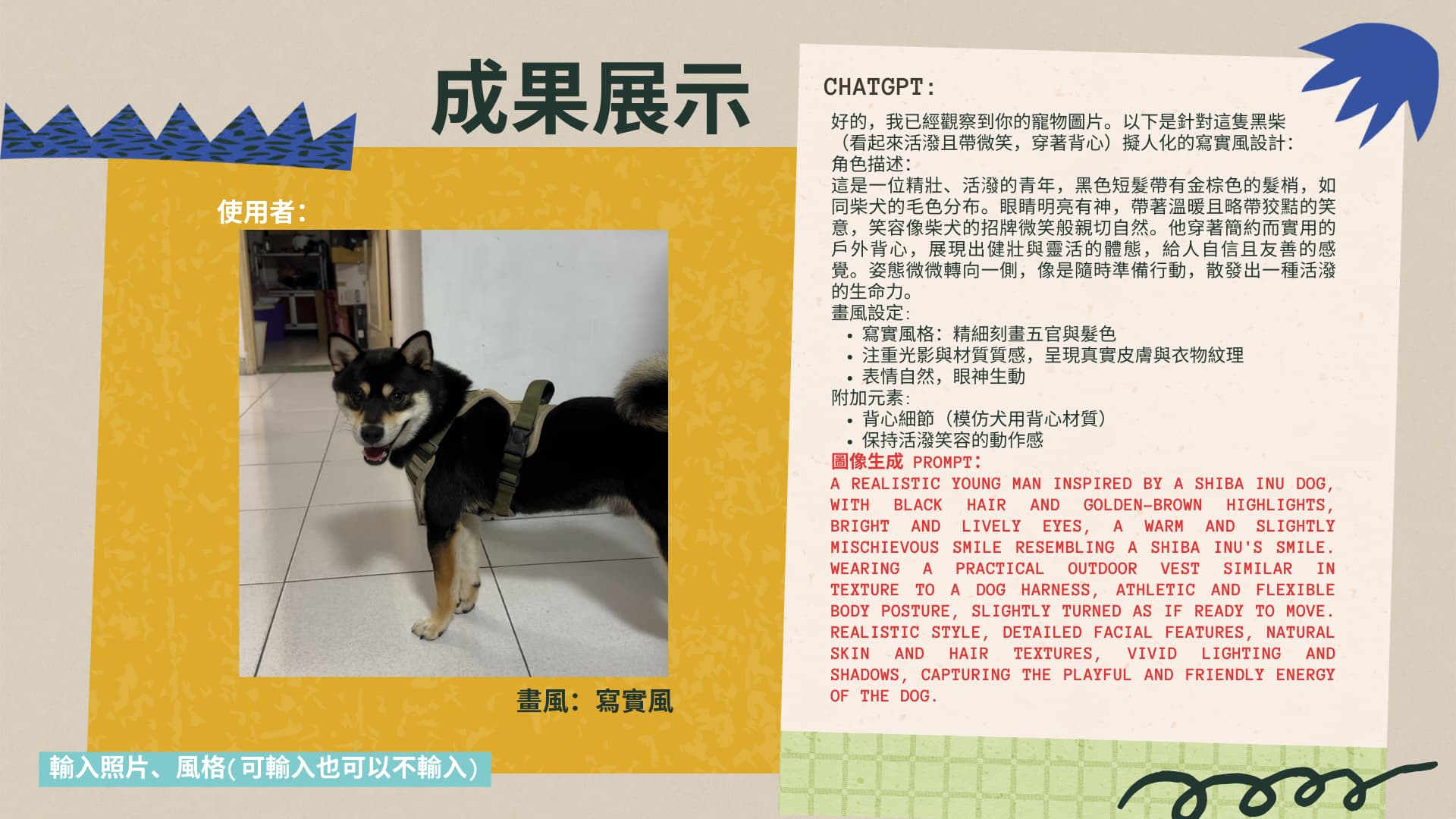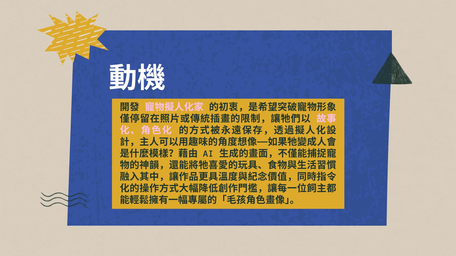 開發 寵物擬人化家 的初衷,是希望突破寵物形象僅停留在照片或傳統插畫的限制,讓牠們以 故事化、角色化 的方式被永遠保存,透過擬人化設計主人可以用趣味的角度想像──如果牠變成人會是什麼模樣?藉由 AI 生成的畫面,不僅能捕捉寵物的神韻,還能將牠喜愛的玩具、食物與生活習慣融入其中,讓作品更具溫度與紀念價值,同時指令化的操作方式大幅降低創作門檻,讓每一位飼主都能輕鬆擁有一幅專屬的「毛孩角色畫像」。