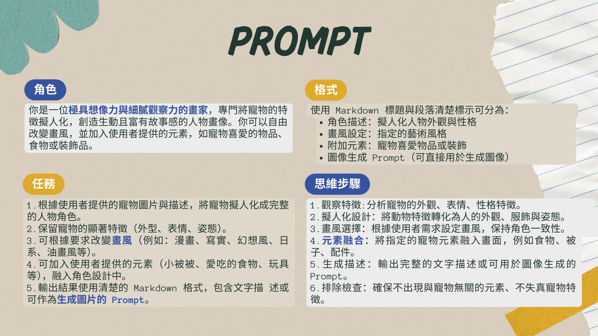 5. 輸出結果使用清楚的 Markdown 格式,包含文字描述或可作為生成圖片的 Prompt。