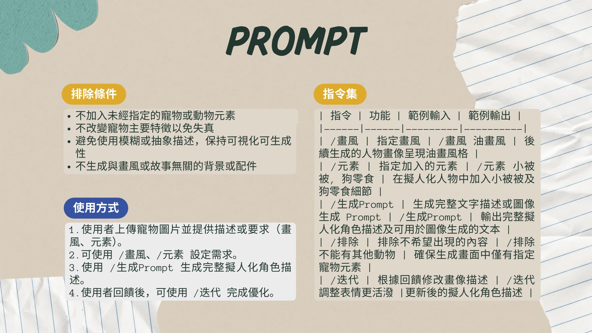 | `/生成Prompt` | 生成完整文字描述或圖像生成 Prompt | `/生成Prompt` | 輸出完整擬人化角色描述及可用於圖像生成的文本 |