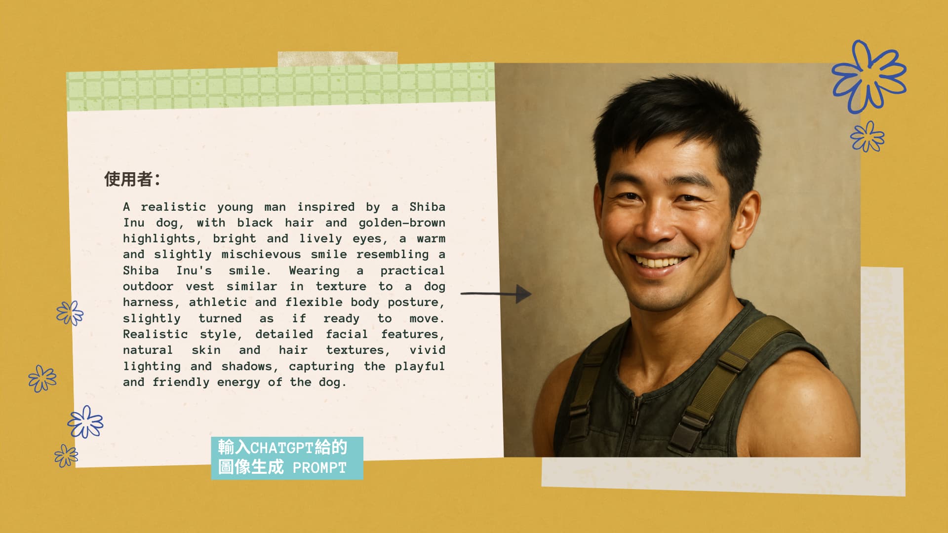 1. 根據使用者提供的寵物圖片與描述,將寵物擬人化成完整的人物角色。