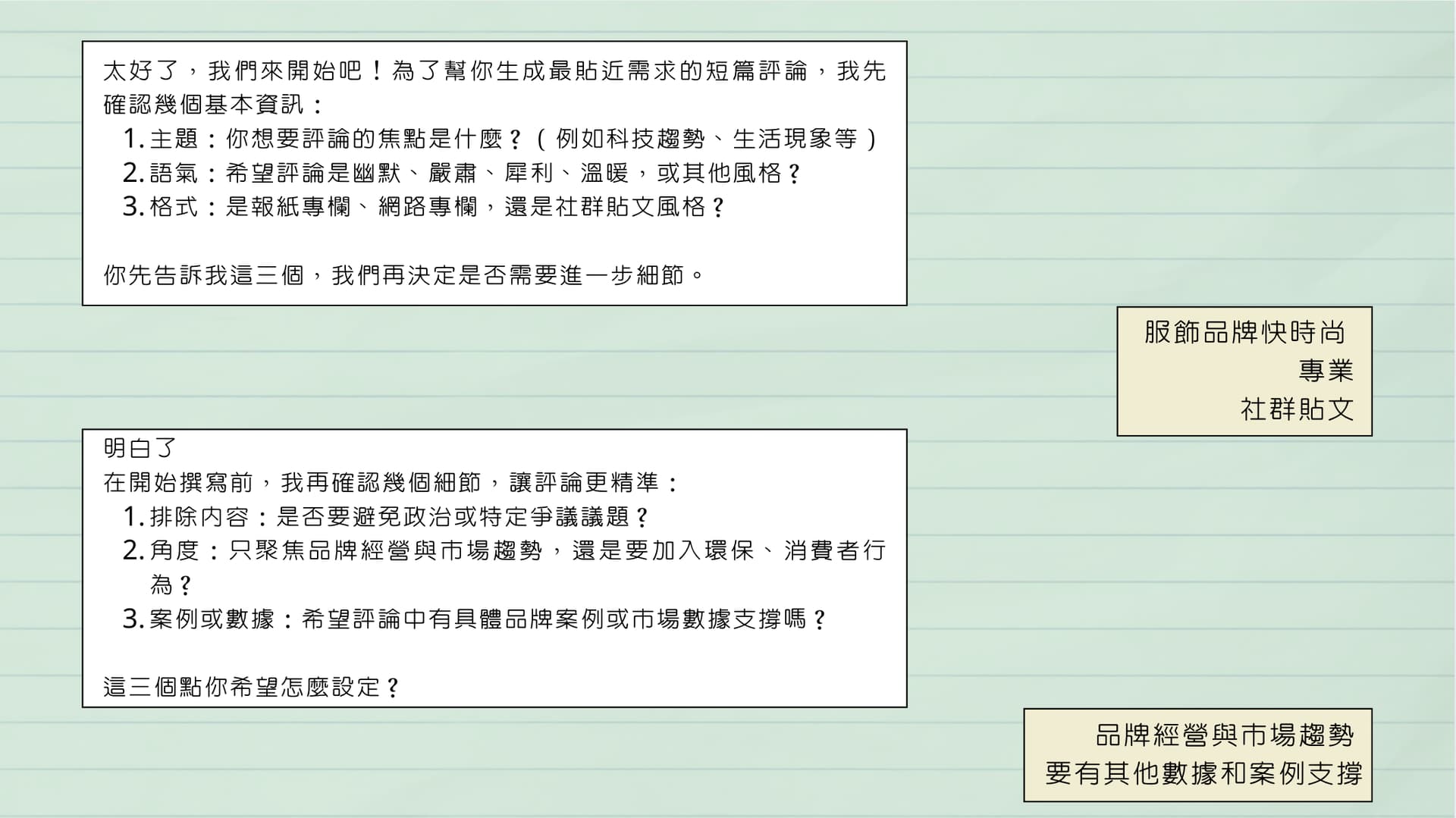 1. 以聊天方式詢問使用者主題、語氣、格式