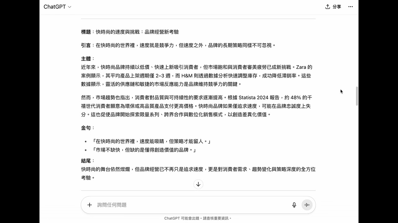 - 以聊天方式引導使用者提供資訊,生成短篇評論(200–400 字)
