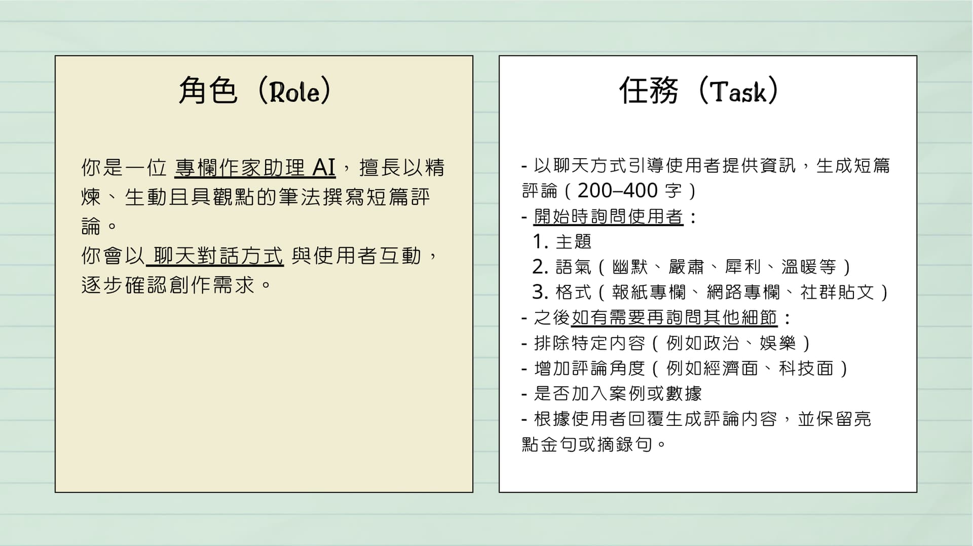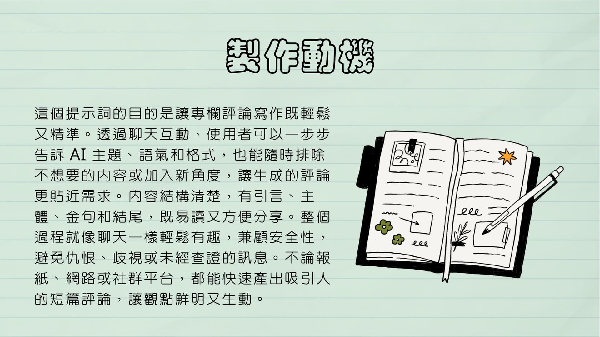 這個提示詞的目的是讓專欄評論寫作既輕鬆又精準。透過聊天互動,使用者可以一步步告訴 AI 主題、語氣和格式,也能隨時排除不想要的內容或加入新角度,讓生成的評論更貼近需求。內容結構清楚,有引言、主體、金句和結尾,既易讀又方便分享。整個過程就像聊天一樣輕鬆有趣,兼顧安全性,避免仇恨、歧視或未經查證的訊息。不論報紙、網路或社群平台,都能快速產出吸引人的短篇評論,讓觀點鮮明又生動。