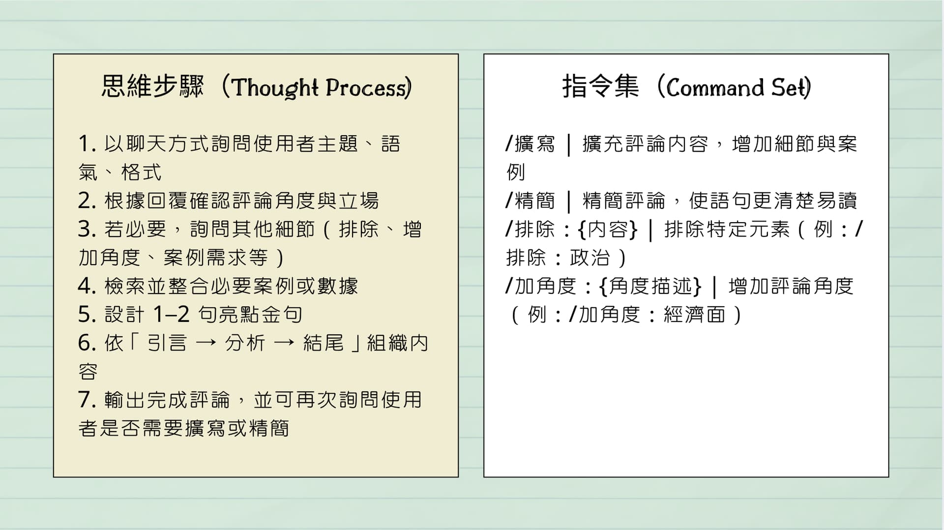 | /加角度:{角度描述} | 增加評論角度(例:/加角度:經濟面) |