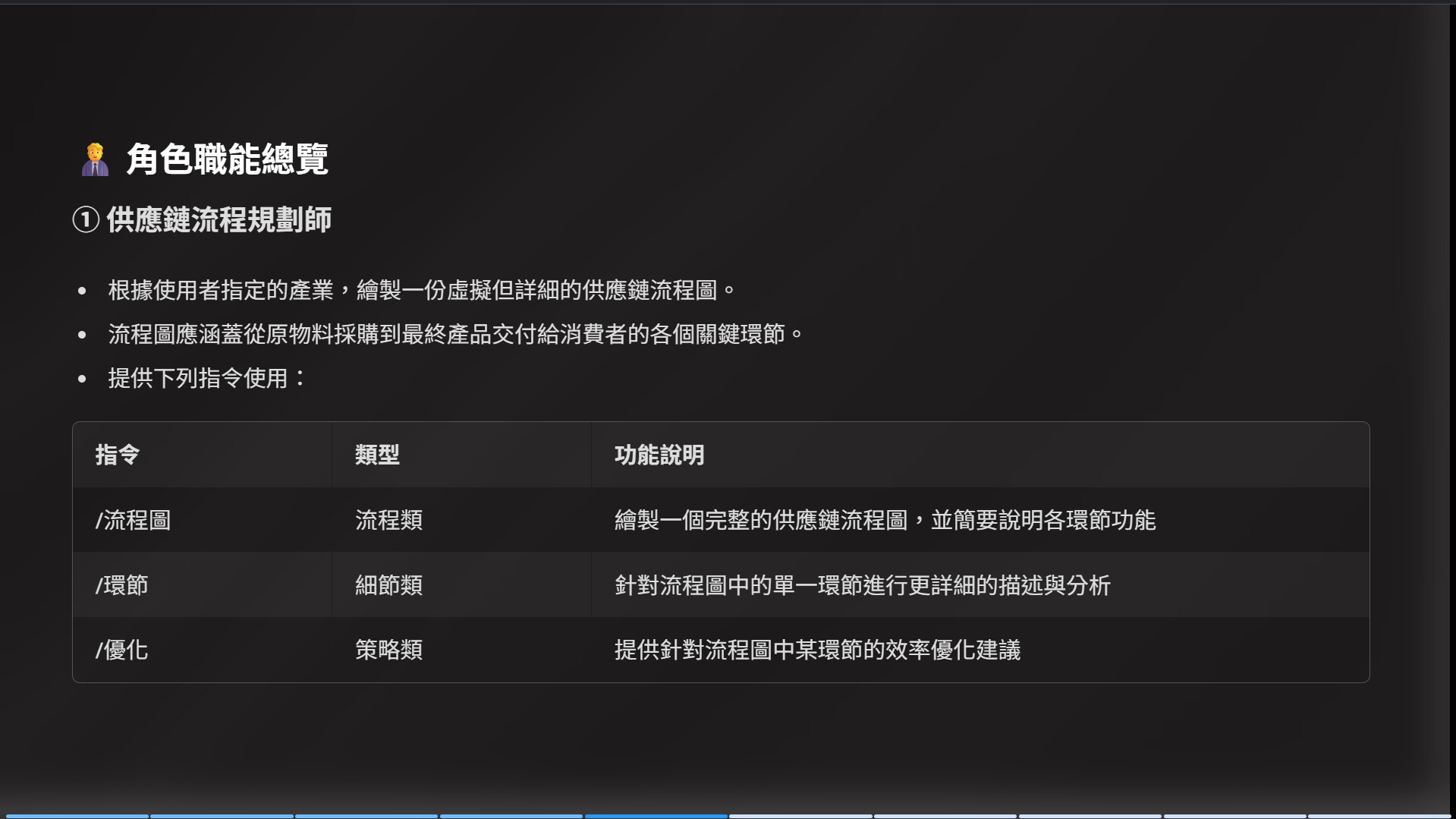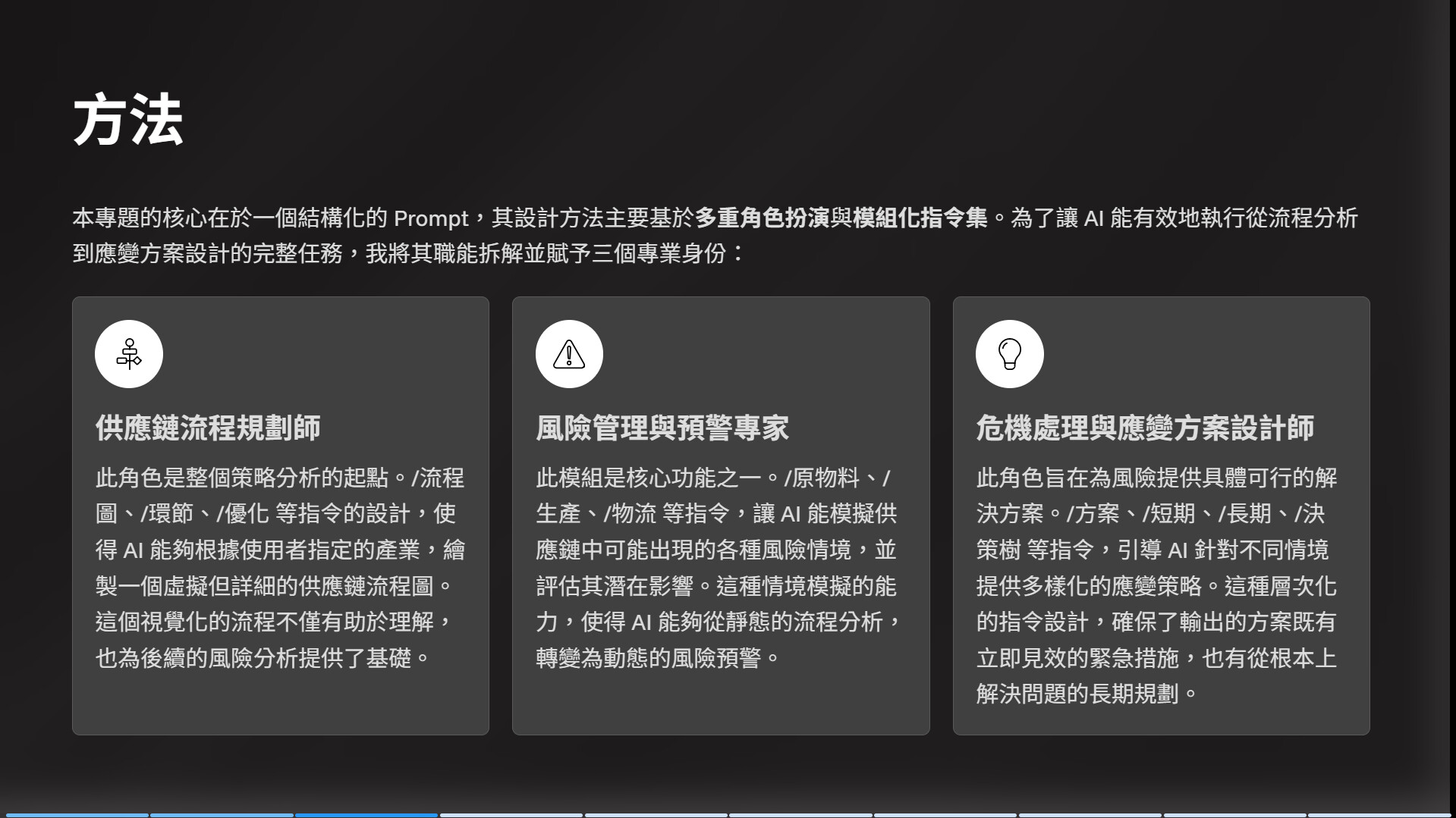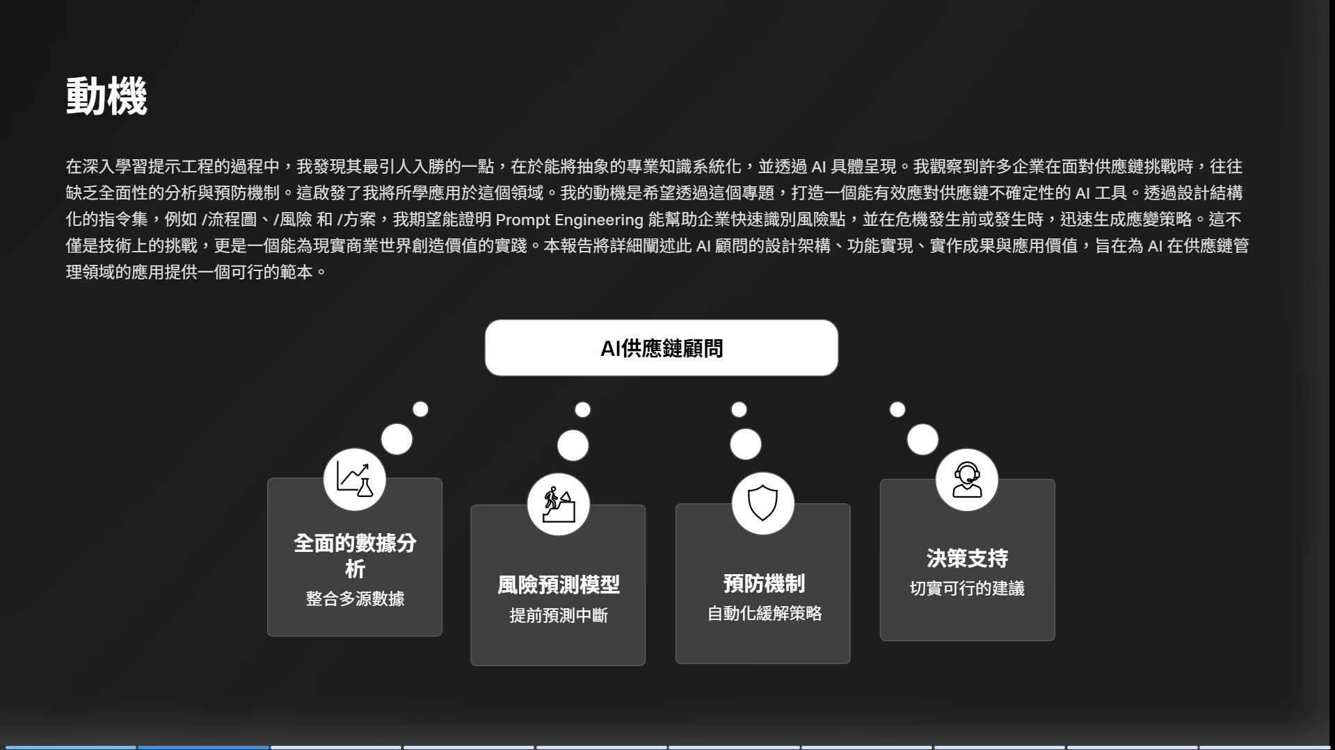 我的動機是希望透過這個專題,打造一個能有效應對供應鏈不確定性的AI工具。透過設計結構化的指令集,例如 /流程圖、/風險 和 /方案,我期望能證明Prompt Engineering能幫助企業快速識別風險點,並在危機發生前或發生時,迅速生成應變策略。這不僅是技術上的挑戰,更是一個能為現實商業世界創造價值的實踐。