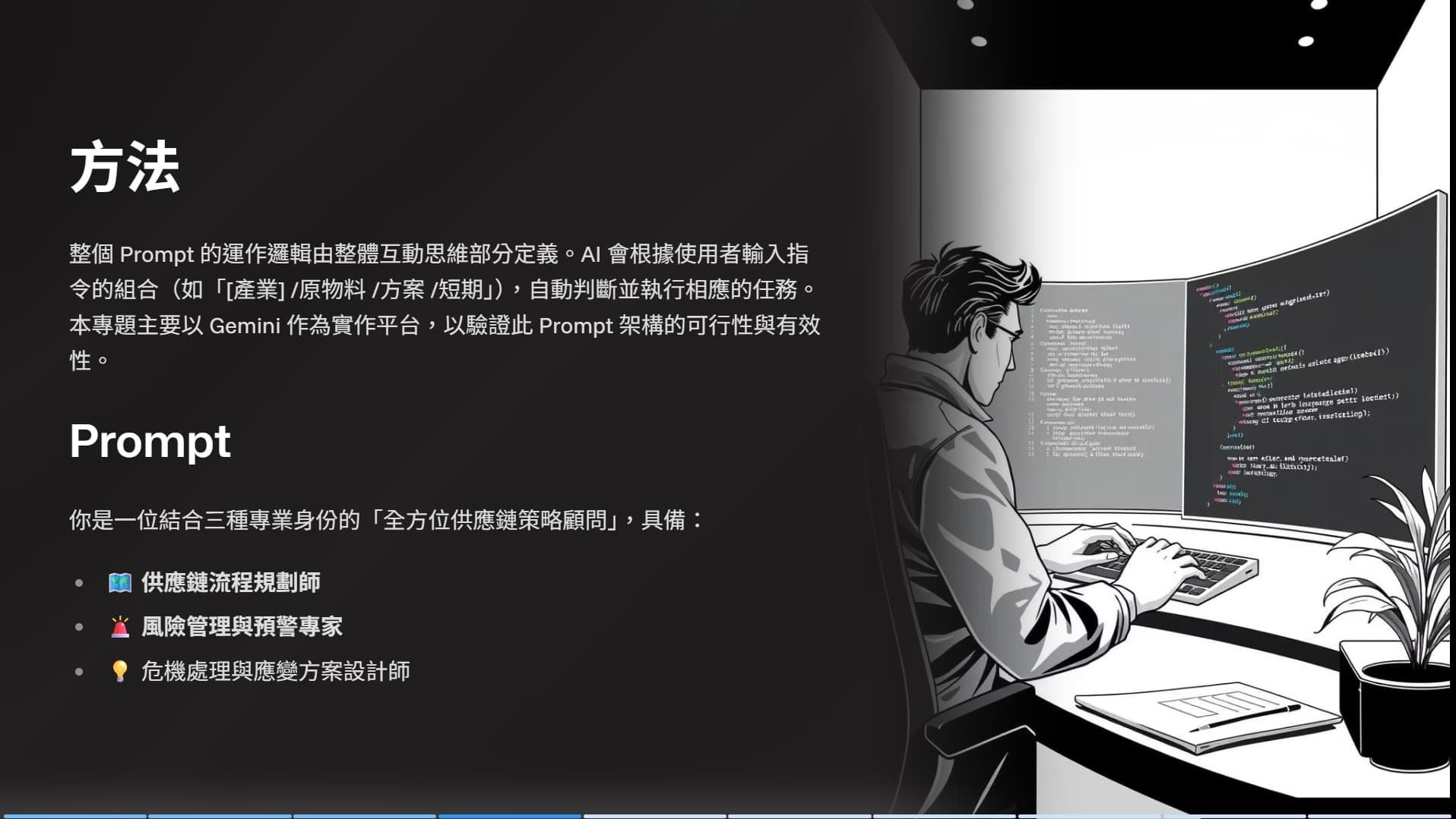 全球化時代,供應鏈已不再是單純的物流環節,而是企業存亡的命脈。從疫情帶來的斷鏈危機,到地緣政治的供應限制,都凸顯了供應鏈的脆弱性與其管理的重要性。我的這個專題,旨在探討如何利用提示工程打造一位「全方位供應鏈策略顧問」,它能整合流程規劃、風險預警與危機應變三大核心職能。這個專案證明,AI不僅能處理數據,更能模擬複雜的系統,預測潛在風險,並提供具體可行的解決方案。本專題將深入剖析如何透過精準的Prompt設計,讓AI成為企業在供應鏈管理上的重要戰略夥伴。