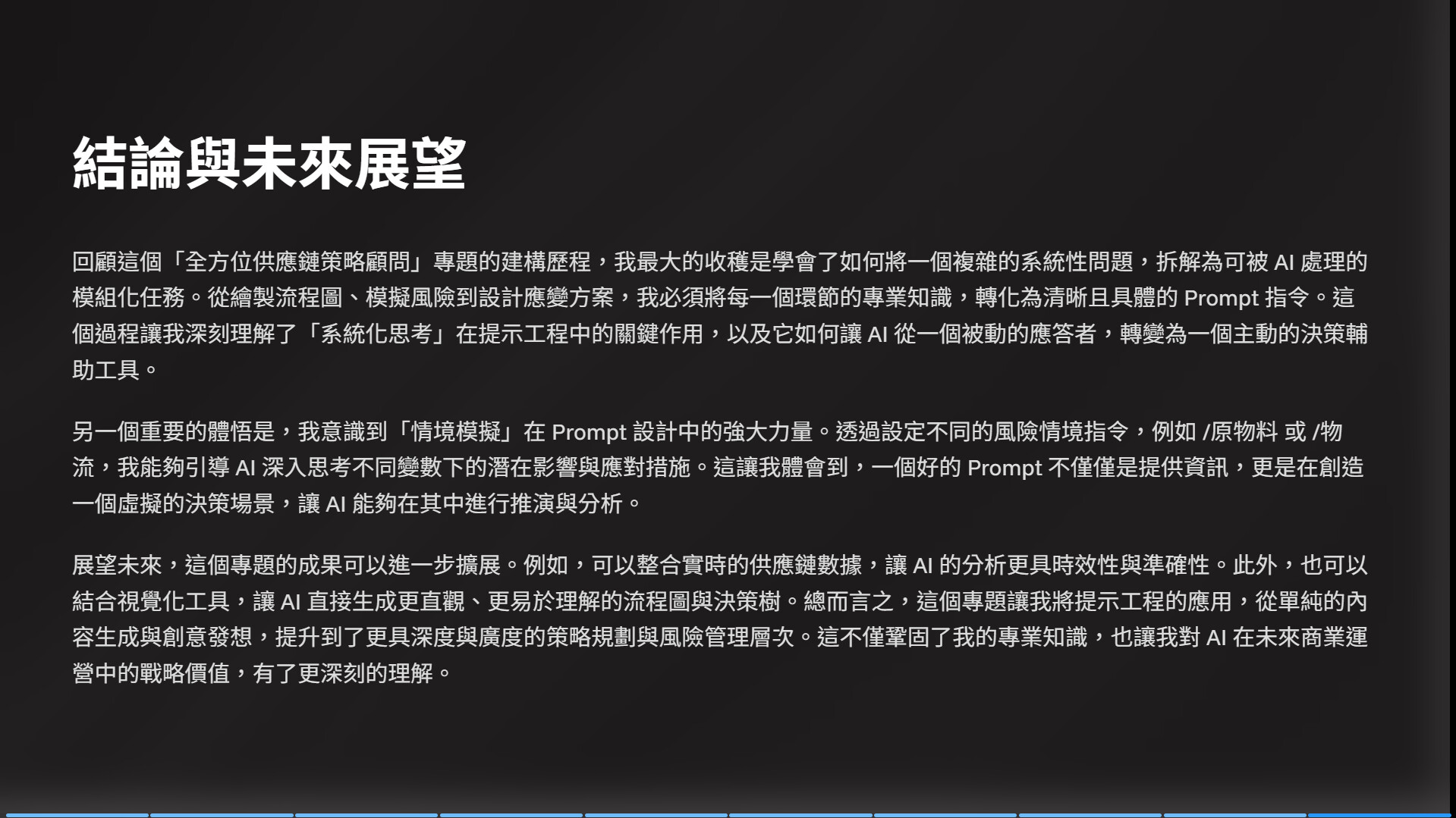 總而言之,這個專題讓我將提示工程的應用,從單純的內容生成與創意發想,提升到了更具深度與廣度的策略規劃與風險管理層次。這不僅鞏固了我的專業知識,也讓我對AI在未來商業運營中的戰略價值,有了更深刻的理解。