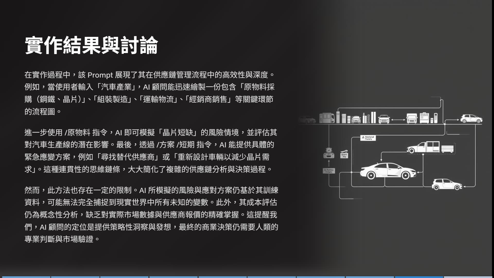 另一個重要的體悟是,我意識到「情境模擬」在Prompt設計中的強大力量。透過設定不同的風險情境指令,例如 /原物料 或 /物流,我能夠引導AI深入思考不同變數下的潛在影響與應對措施。這讓我體會到,一個好的Prompt不僅僅是提供資訊,更是在創造一個虛擬的決策場景,讓AI能夠在其中進行推演與分析。