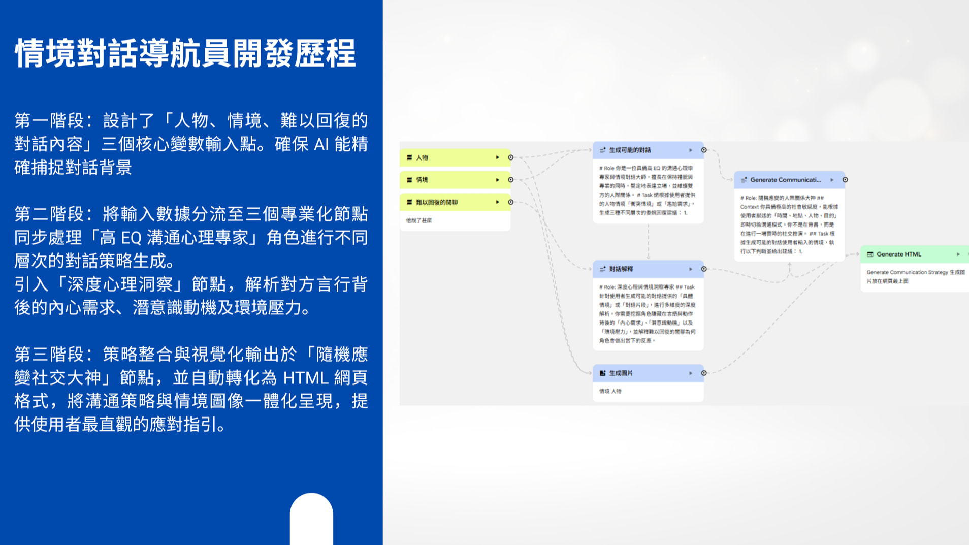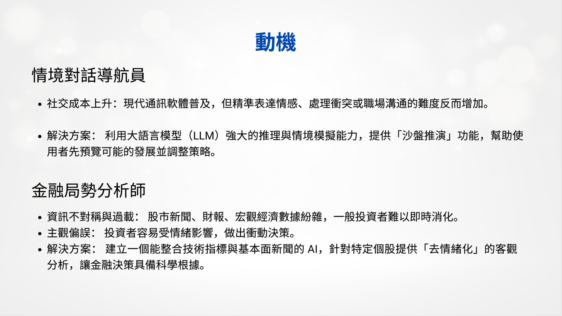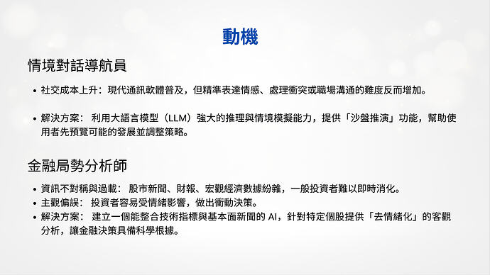 解決方案:利用大語言模型(LLM)強大的推理與情境模擬能力,提供「沙盤推演」功能,幫助使