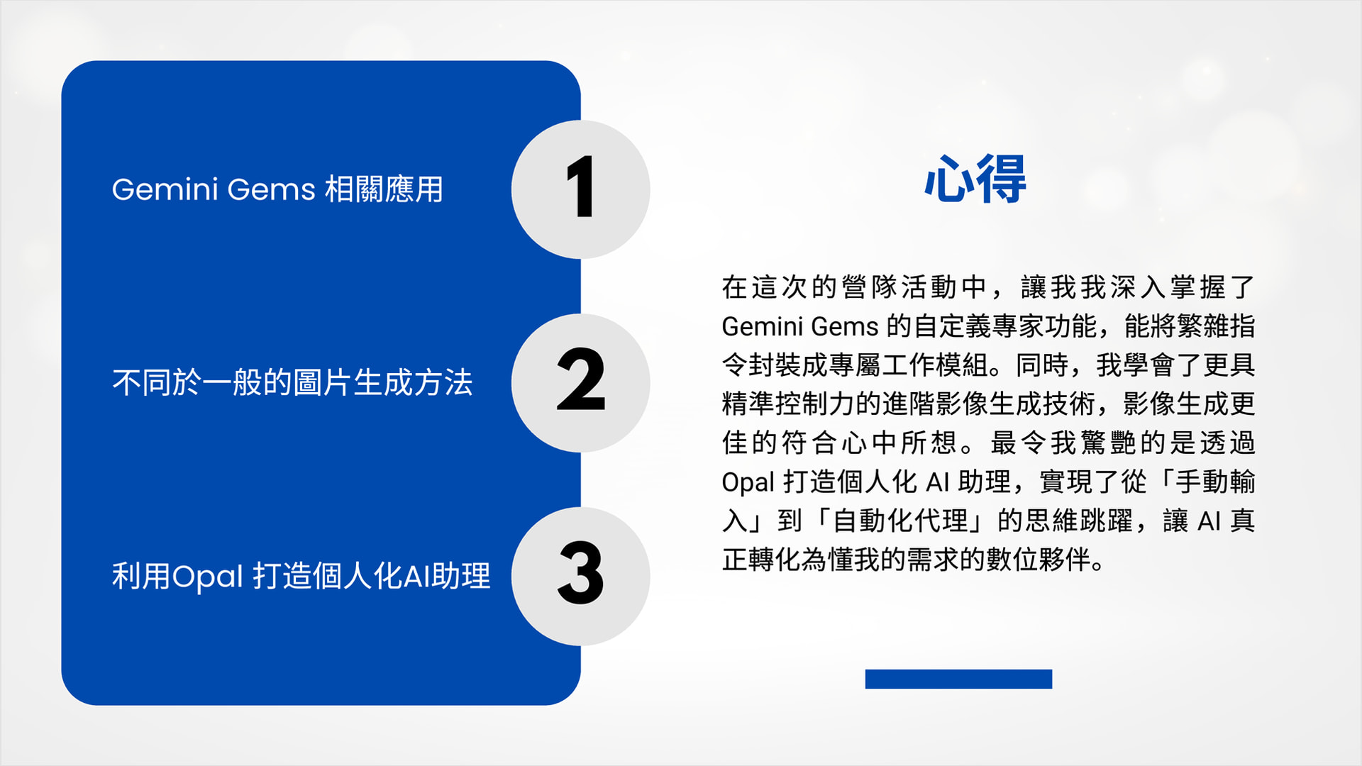 在這次的營隊活動中,我對 AI 工具的認知從「單一指令」提升到了「系統化協作」的高度。透過深入掌握 Gemini Gems 的自定義專家功能,我學會了如何將繁雜、重複性的指令精準封裝成專屬的工作模組,大幅優化了人機協作的效率。