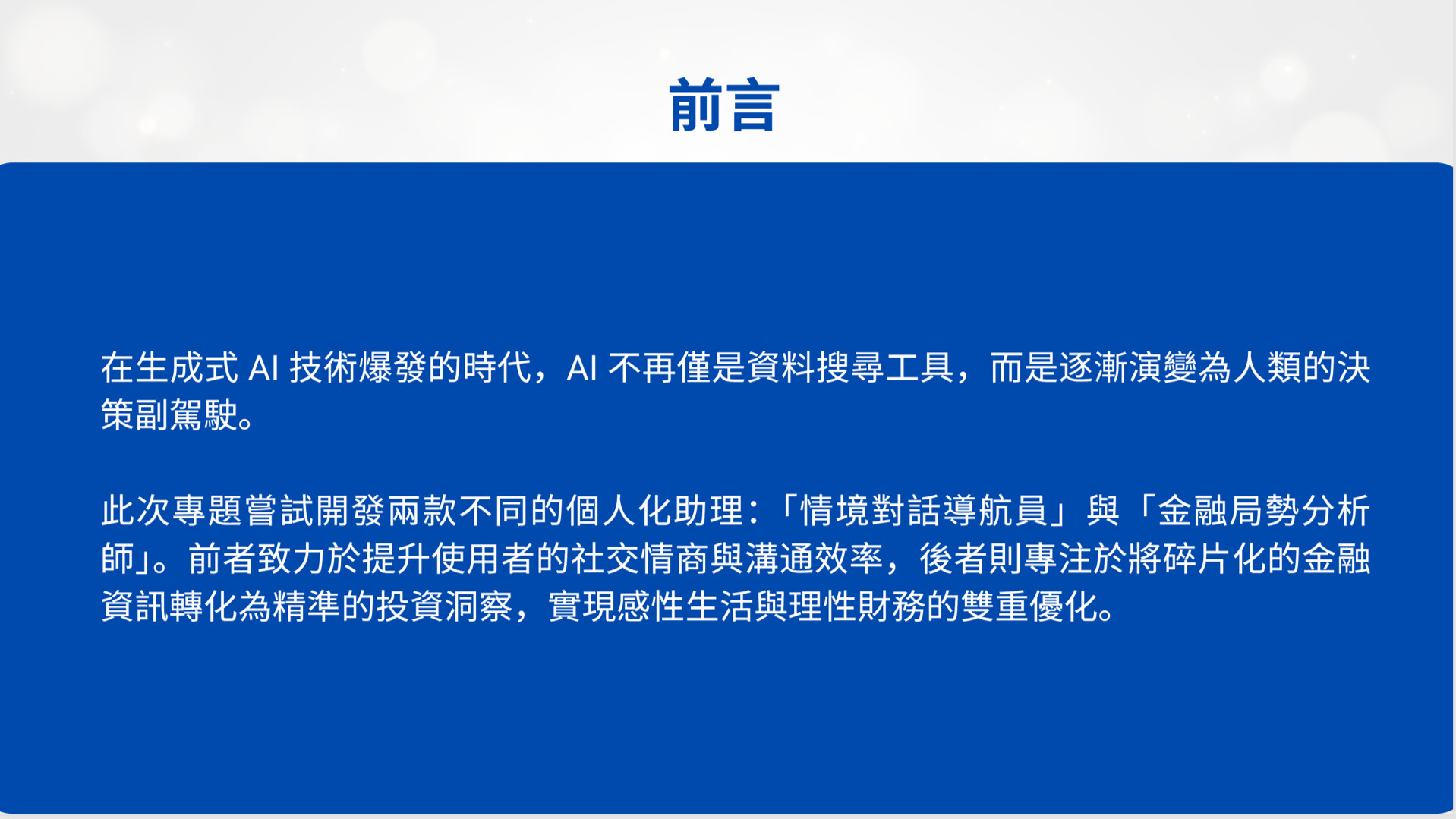 此次專題嘗試開發兩款不同的個人化助理:「情境對話導航員」與「金融局勢分析