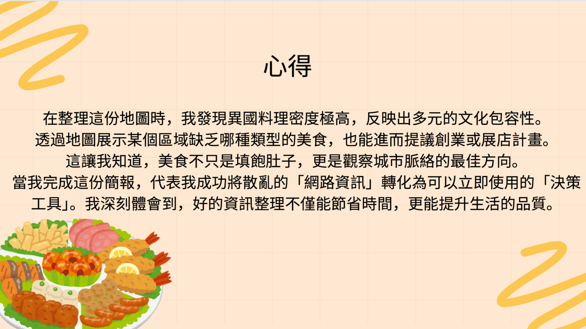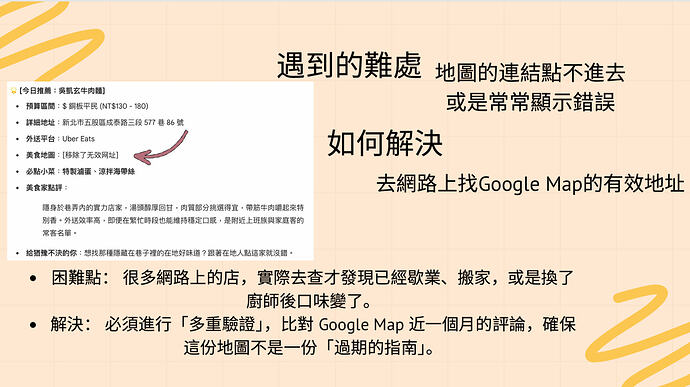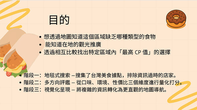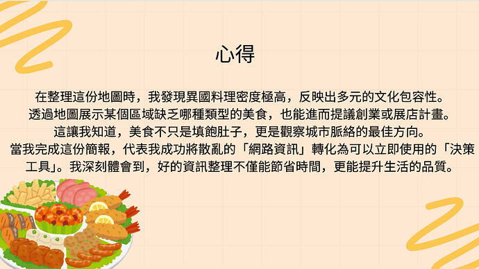 在整理這份地圖時,我發現異國料理密度極⾼,反映出多元的⽂化包容性。透過地圖展⽰某個區域缺乏哪種類型的美⻝,也能進⽽提議創業或展店計畫。這讓我知道,美⻝不只是填飽肚⼦,更是觀察城市脈絡的最佳⽅向。當我完成這份簡報,代表我成功將散亂的「網路資訊」轉化為可以⽴即使⽤的「決策⼯具」。我深刻體會到,好的資訊整理不僅能節省時間,更能提升⽣活的品質。