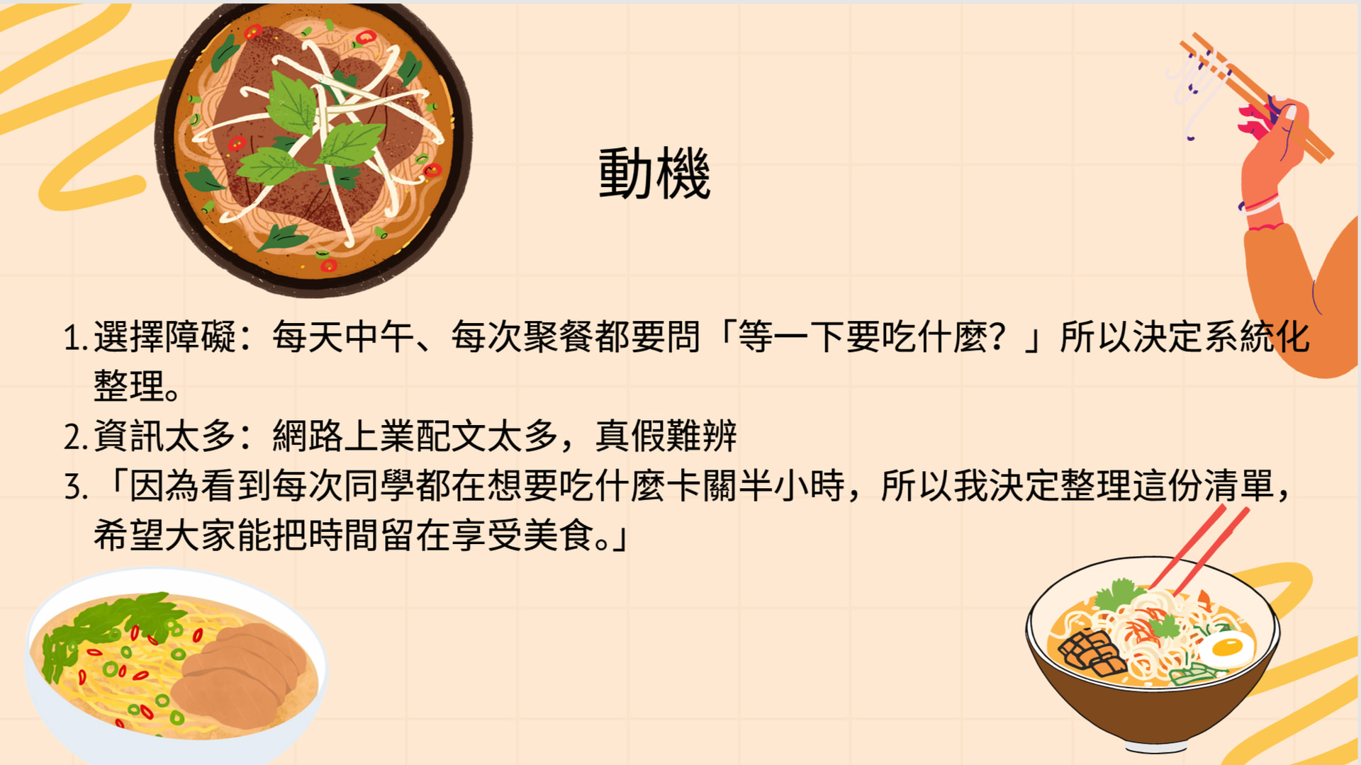 3.因為看到每次同學都在想要吃什麼卡關半⼩時,所以我決定整理這份清單,希望⼤家能把時間留在享受美⻝。
